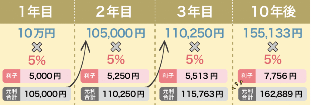 1年目:¥100,000で得た運用利益5% →利益¥5,000 合計¥105,000