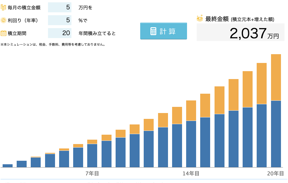 毎月5万円を20年積み立てると、元本1,200万円が約2,036万円に