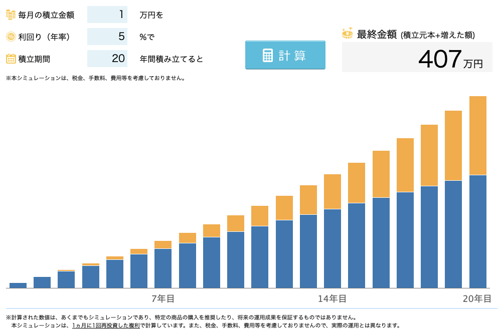 毎月1万円でも20年間コツコツ積み立てて年5%で運用できれば、元本の240万円が約407万円に増えます