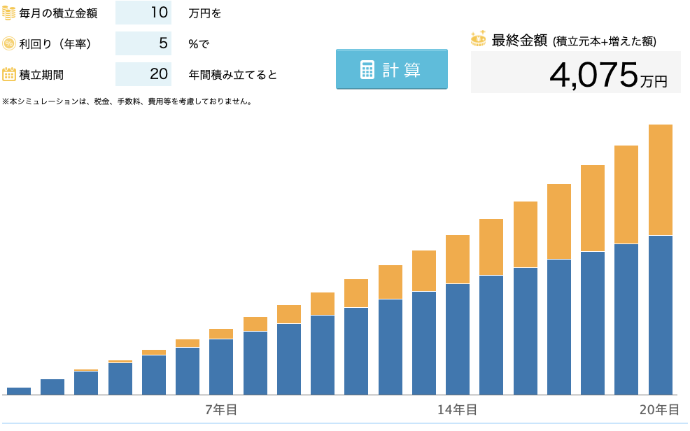 毎月10万円を積み立てると、20年後には約4,073万円に