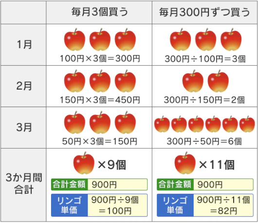 価格が高いときは少ししか買えず、価格が安いときは多く買えるため、購入単価が平均化され、リスクを抑える効果が期待できます
