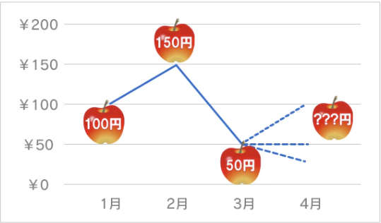 買えるリンゴの数はリンゴの価格に影響を受けるので、リンゴの価格が高い時には少ない個数しか買えないが、安い時には多くたくさん買える