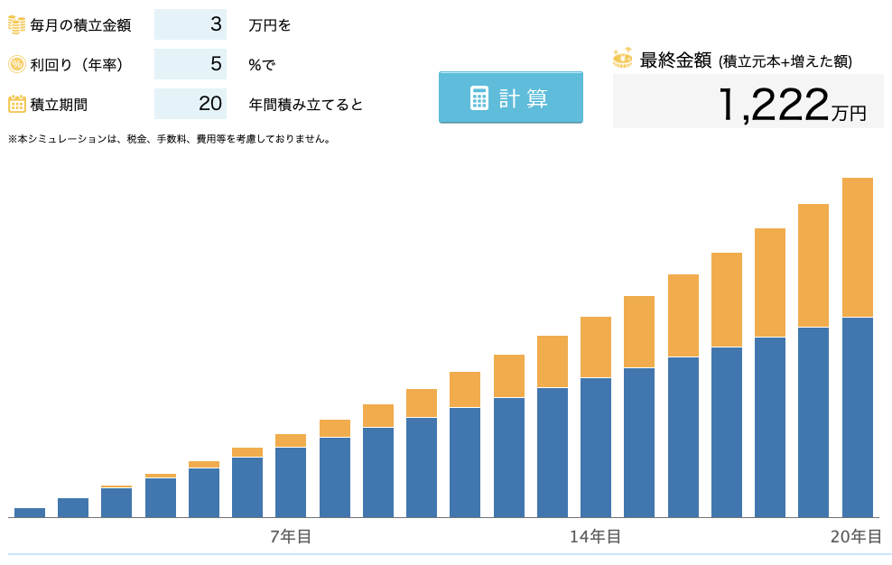 毎月3万円を積み立てると、20年後には元本720万円が約1,222万円に