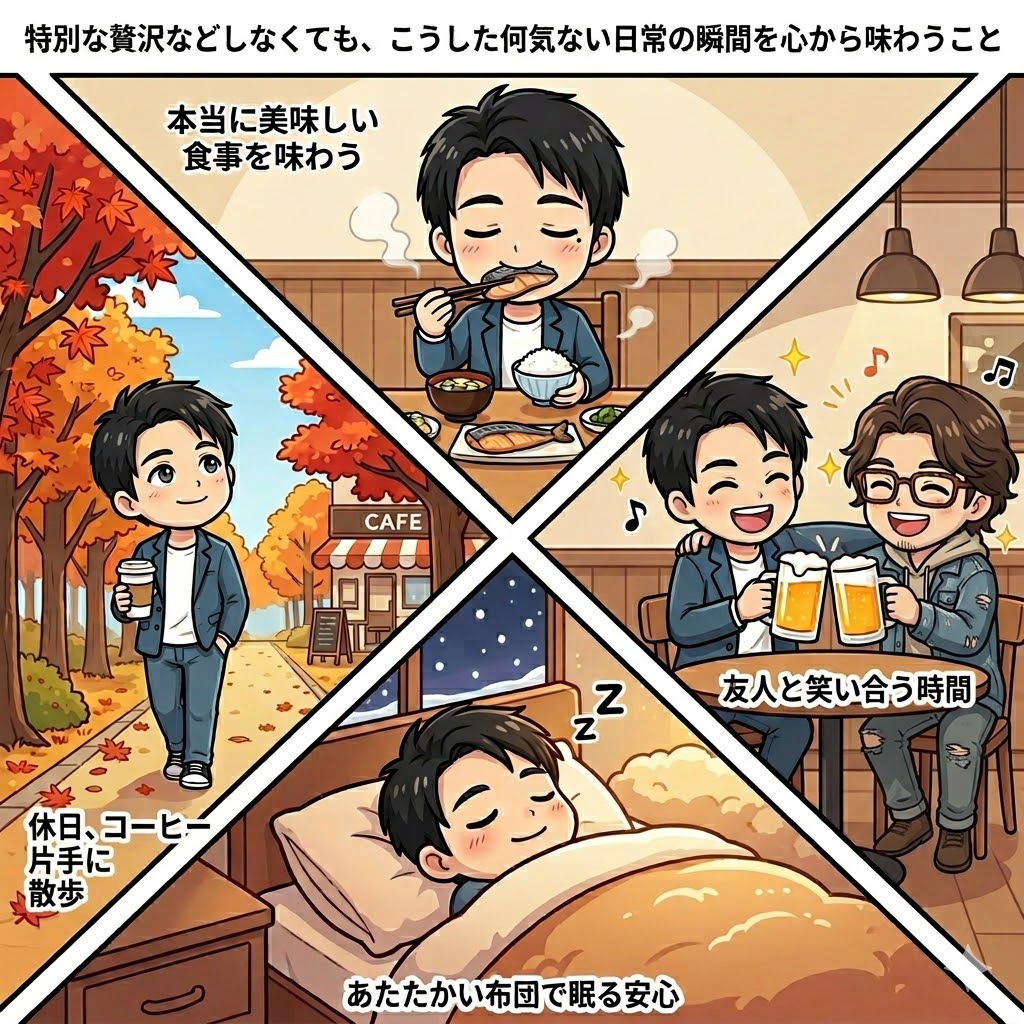 本当に美味しいと感じながら味わう食事。心から笑い合える友人との時間。冷え込む冬でも、毎日あたたかい布団で安心して眠りにつけること。休日の朝にはゆっくりとコーヒーを淹れ、季節の移り変わりを感じながら散歩ができること。 特別な贅沢などしなくても、こうした何気ない日常の瞬間を「心から味わえるようになったこと」こそが、私にとって最大の財産です。